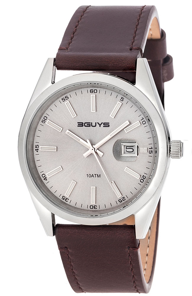 Ανδρικό ρολόι 3Guys από ανοξείδωτο ατσάλι με ασημί καντράν και καφέ δερμάτινο λουράκι.