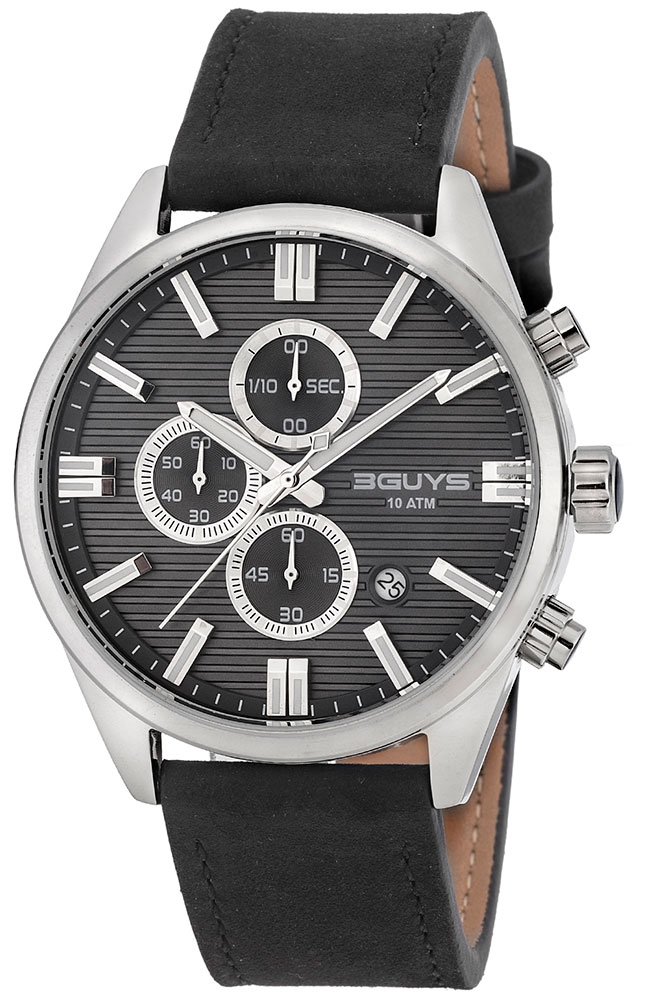 Ανδρικό ρολόι χρονογράφος 3Guys από ανοξείδωτο ατσάλι με γκρι καντράν και μαύρο δερμάτινο λουράκι.