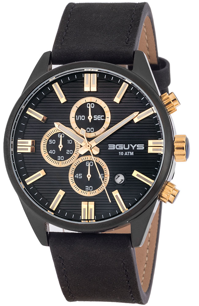 Ανδρικό ρολόι χρονογράφος 3Guys από μαύρο ανοξείδωτο ατσάλι με μαύρο καντράν και μαύρο δερμάτινο λουράκι.