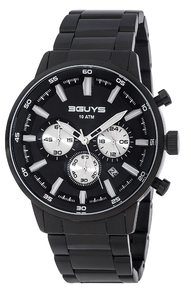 Ανδρικό ρολόι χρονογράφος 3Guys από μαύρο ανοξείδωτο ατσάλι με μαύρο καντράν και μαύρο μπρασελέ.