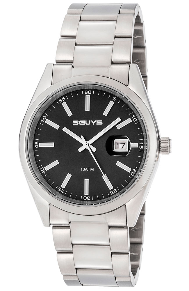 Ανδρικό ρολόι 3Guys από ανοξείδωτο ατσάλι με μαύρο καντράν και ασημί μπρασελέ.