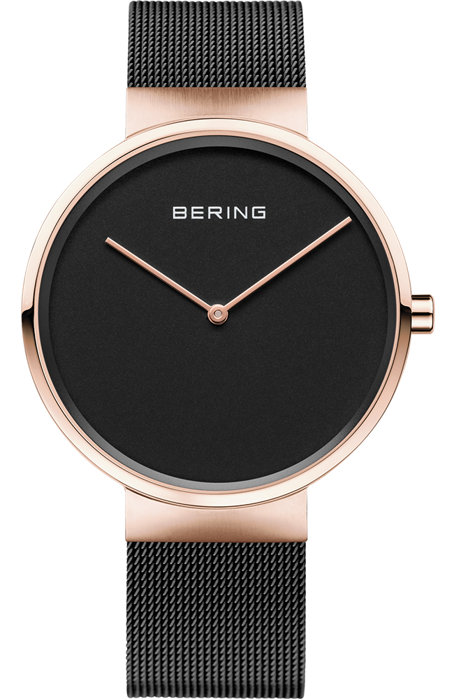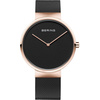 Γυναικείο ρολόι Bering από ροζ επιχρυσωμένο ανοξείδωτο ατσάλι με μαύρο καντράν και μπρασελέ.