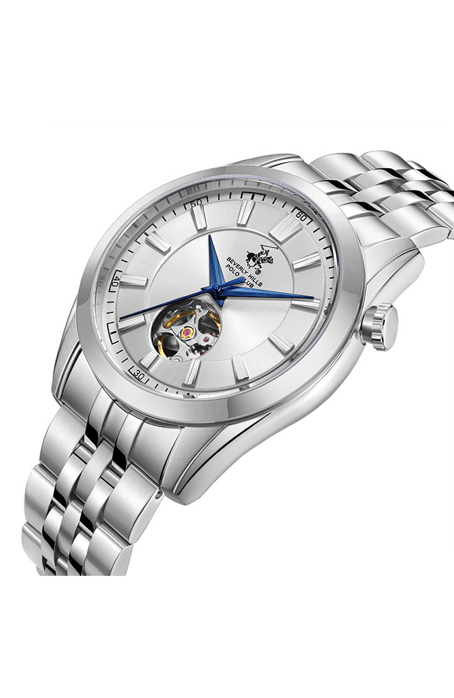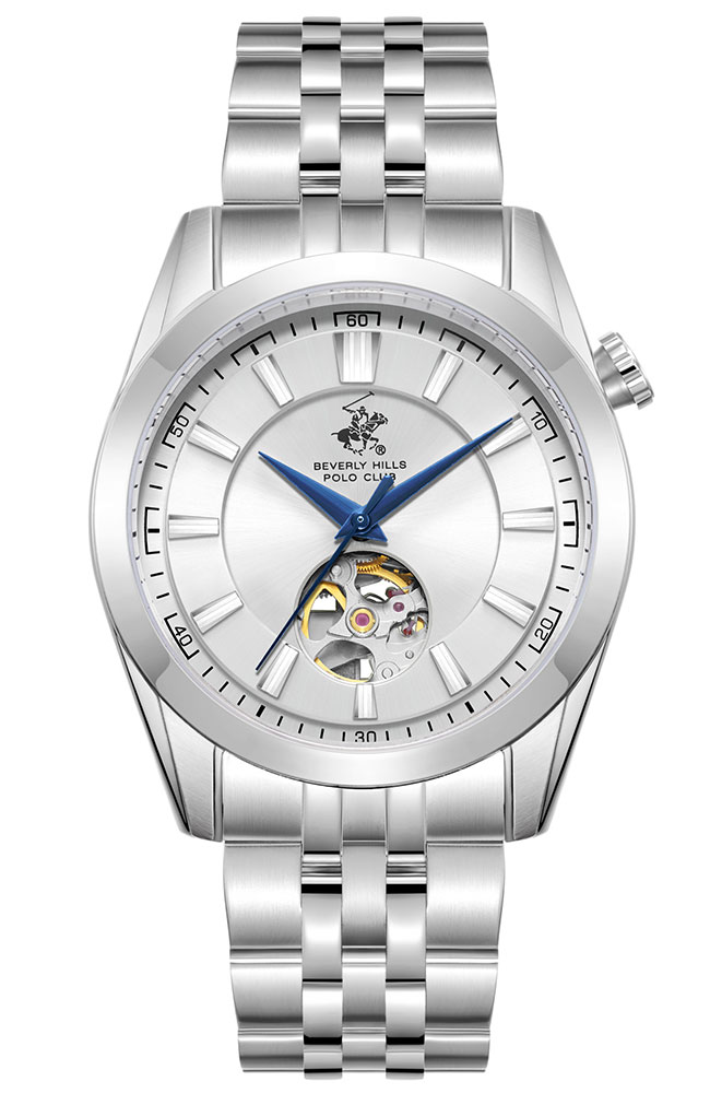 Ανδρικό Ρολόι Beverly Hills Polo Club με αυτόματο μηχανισμό από ανοξείδωτο ατσάλι με ασημί καντράν και ασημί μπρασελέ.