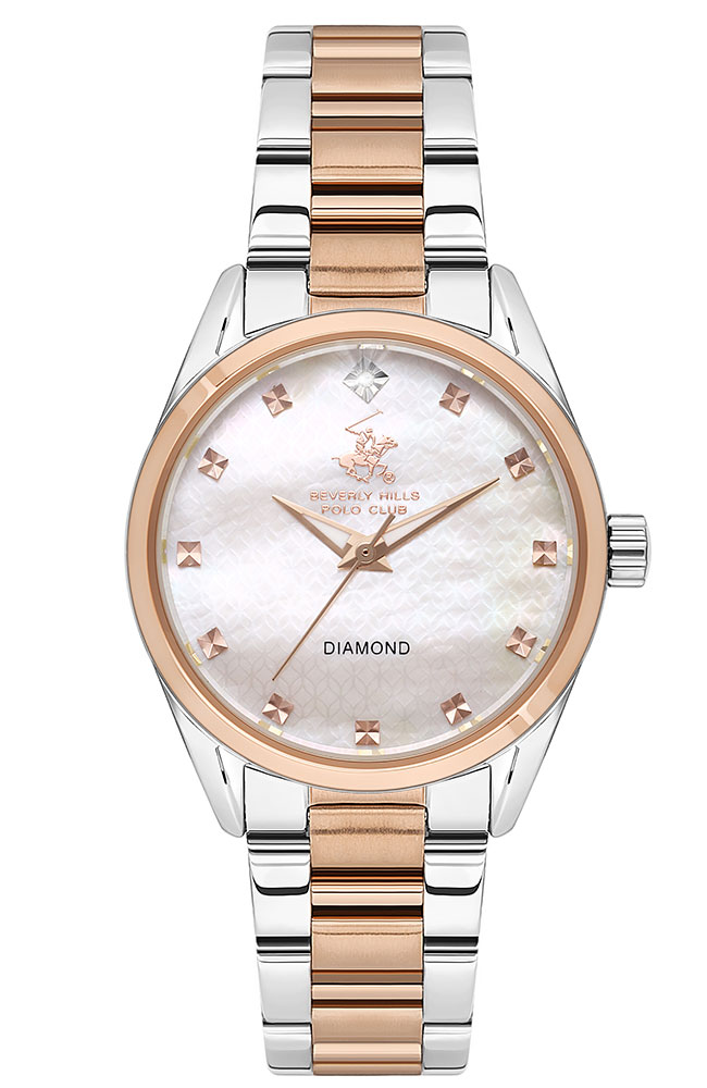 Γυναικείο ρολόι Beverly Hills Polo Club από ανοξείδωτο ατσάλι με ροζ φίλντισι καντράν, λευκό Διαμάντι και δίχρωμο μπρασελέ.