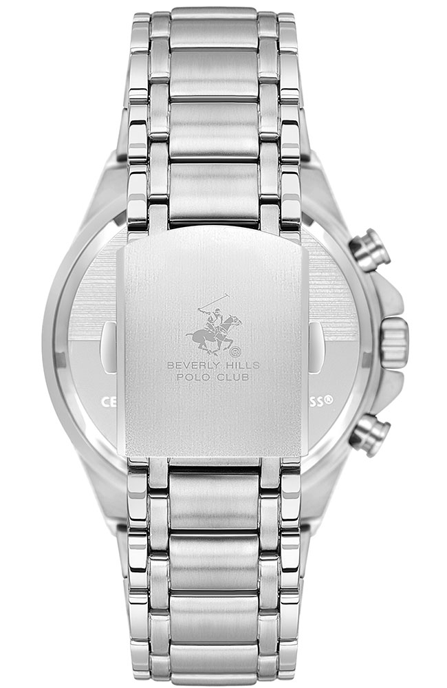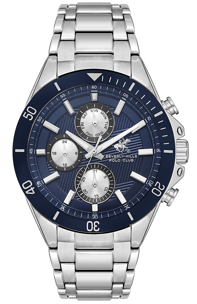 Ανδρικό Ρολόι Beverly Hills Polo Club από ανοξείδωτο ατσάλι με μπλε καντράν και ασημί μπρασελέ.