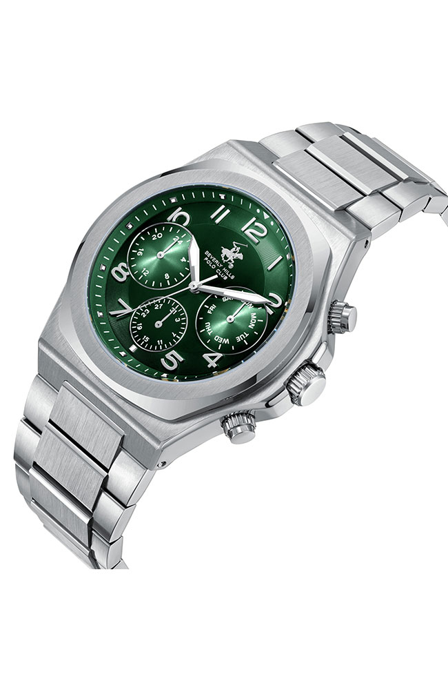 Ανδρικό ρολόι Beverly Hills Polo Club από ανοξείδωτο ατσάλι με πράσινο καντράν και ασημί μπρασελέ.