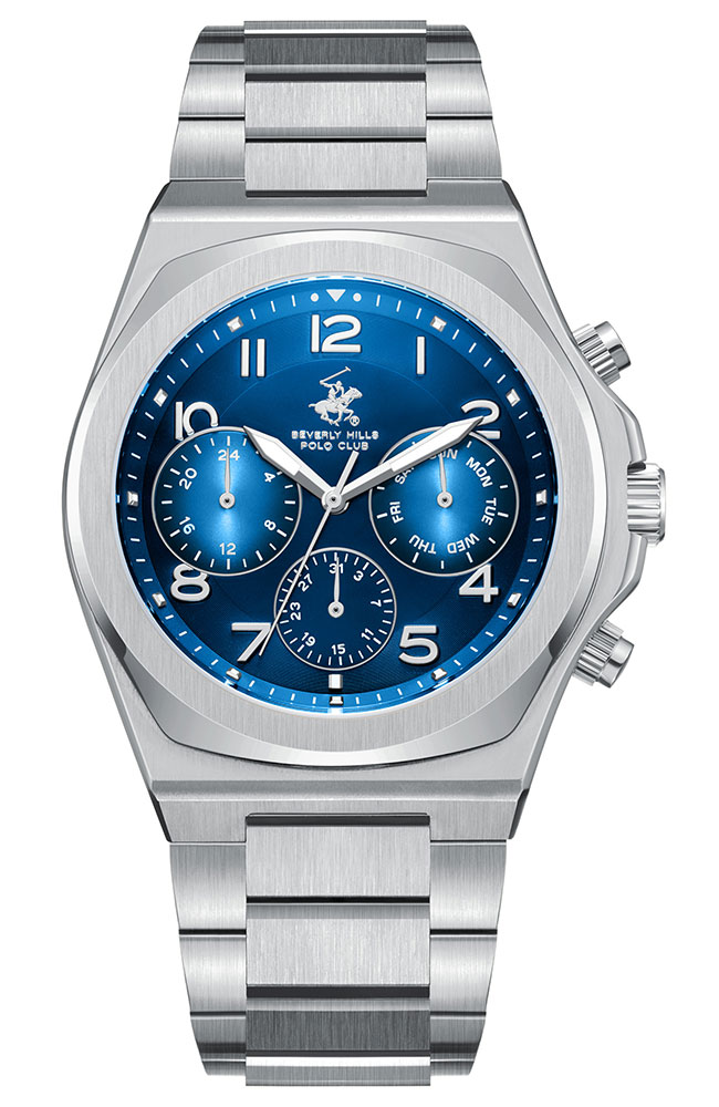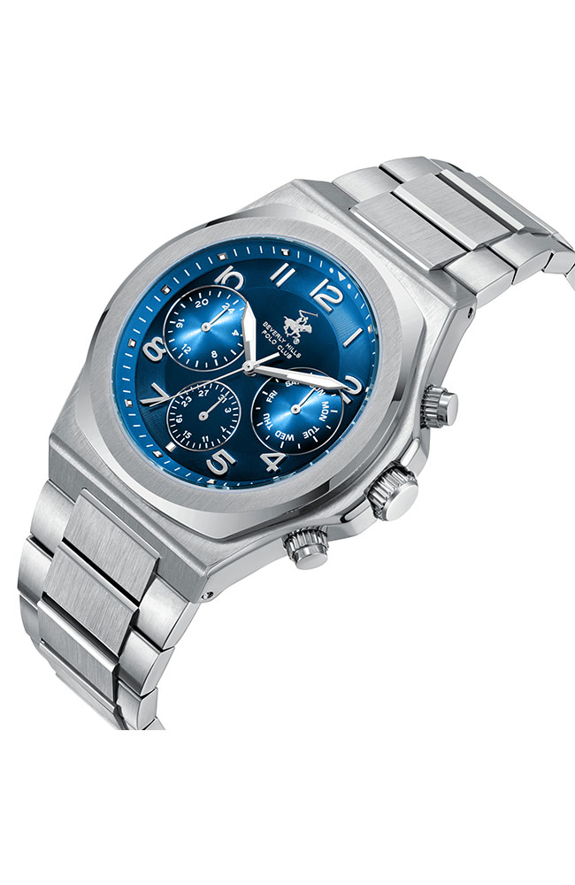Ανδρικό ρολόι Beverly Hills Polo Club από ανοξείδωτο ατσάλι με μπλε καντράν και ασημί μπρασελέ.