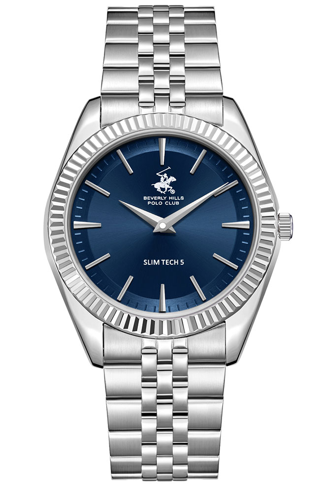 Ανδρικό Ρολόι Beverly Hills Polo Club από ανοξείδωτο ατσάλι με μπλε καντράν και ασημί μπρασελέ.