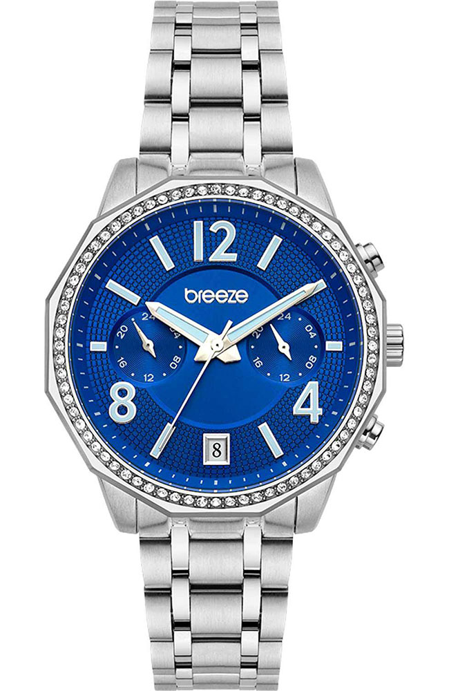 Γυναικείο ρολόι χειρός Breeze από ανοξείδωτο ατσάλι με μπλε καντράν, πέτρες ζιργκόν και μπρασελέ.