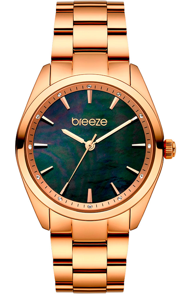 Γυναικείο ρολόι χειρός Χρονογράφος Breeze από ανοξείδωτο ατσάλι με μαύρο φίλντισι καντράν, πέτρες ζιργκόν και ροζ χρυσό μπρασελέ.