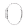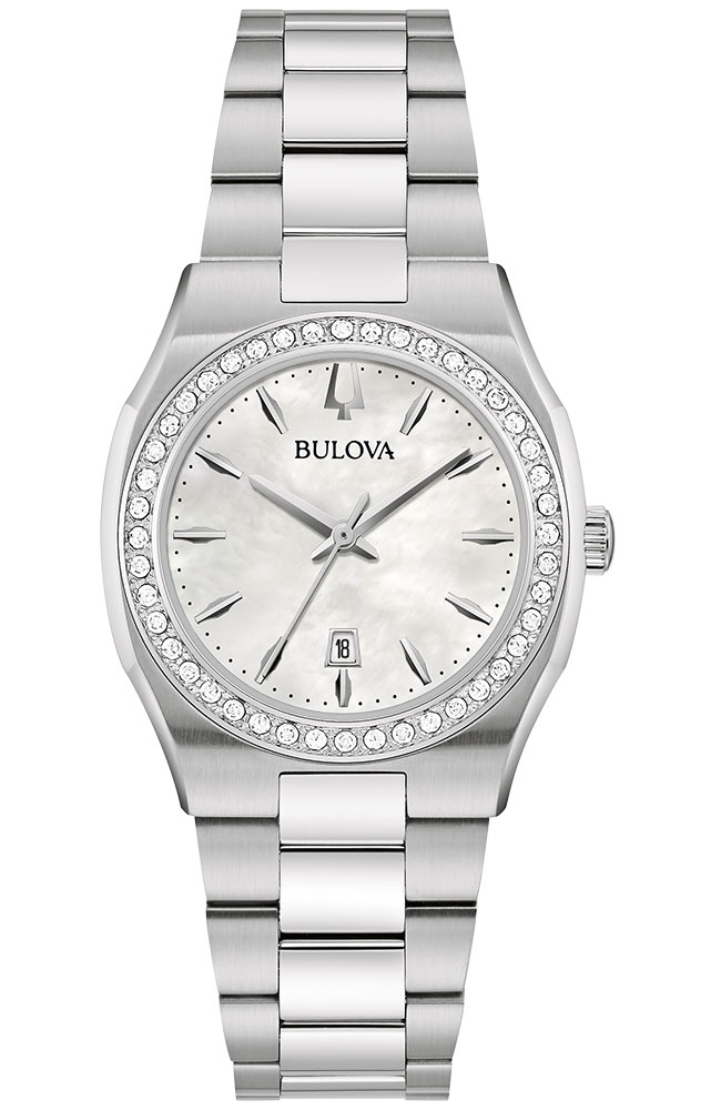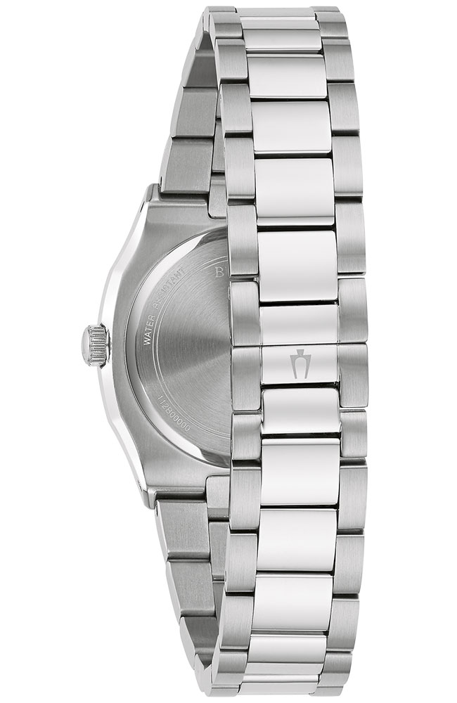 Γυναικείο ρολόι Bulova από ανοξείδωτο ατσάλι με λευκό φίλντισι καντράν, πέτρες Ζιργκόν και ασημί μπρασελέ.