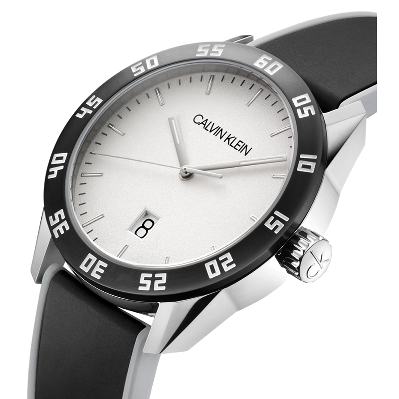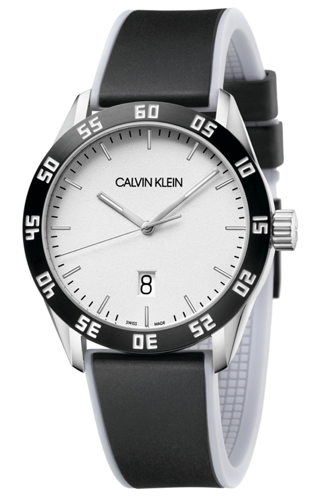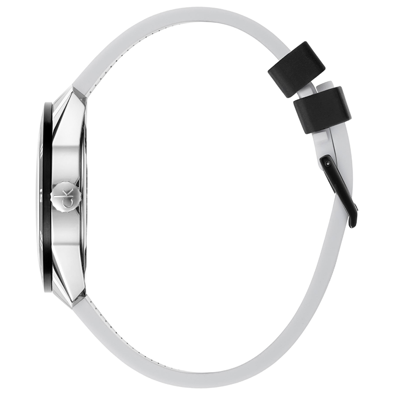 Ανδρικό ρολόι Calvin Klein Ελβετικής κατασκευής από ανοξείδωτο ατσάλι με λευκό καντράν και μαύρο καουτσούκ λουράκι.