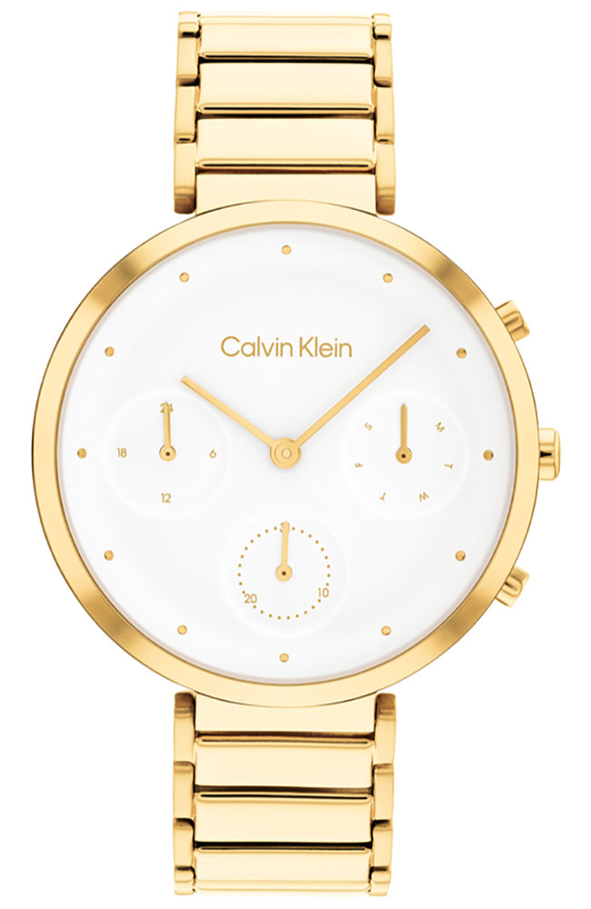 Γυναικείο ρολόι Calvin Klein από επιχρυσωμένο ανοξείδωτο ατσάλι με λευκό καντράν και χρυσό μπρασελέ.