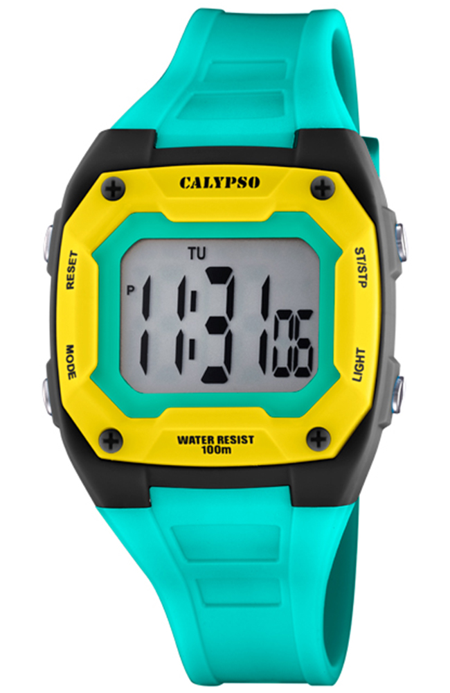 Παιδικό ρολόι χειρός Calypso με ψηφιακό καντράν και τιρκουάζ καουτσούκ λουράκι.