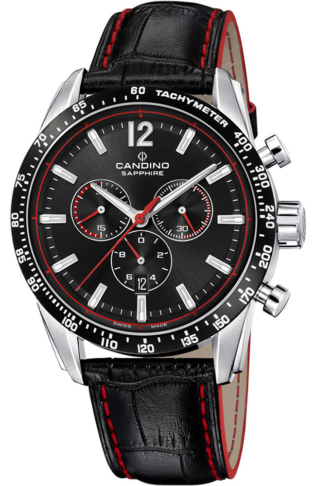 Ανδρικό ρολόι Candino Ελβετικής κατασκευής από ανοξείδωτο ατσάλι με μαύρο καντράν και μαύρο δερμάτινο λουράκι.