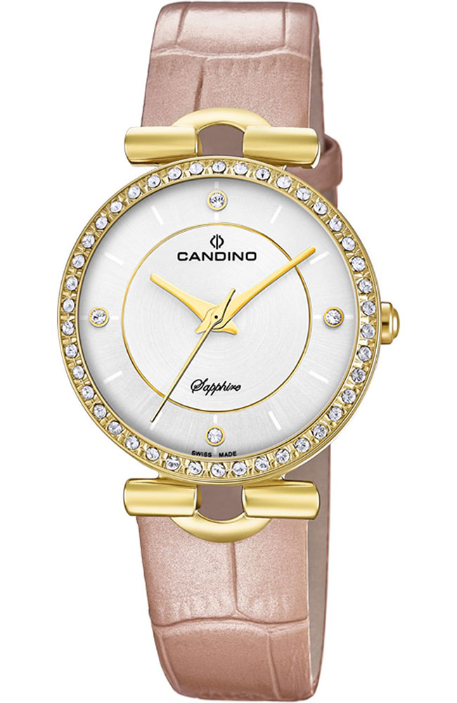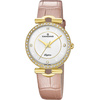 Γυναικείο ρολόι Candino Ελβετικής κατασκευής από επιχρυσωμένο ανοξείδωτο ατσάλι με λευκό καντράν, πέτρες ζιργκόν και ροζ δερμάτινο λουράκι.