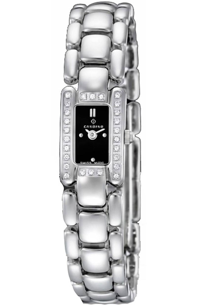 Γυναικείο ρολόι Candino Ελβετικής κατασκευής από ανοξείδωτο ατσάλι με μαύρο καντράν, πέτρες ζιργκόν και μπρασελέ.