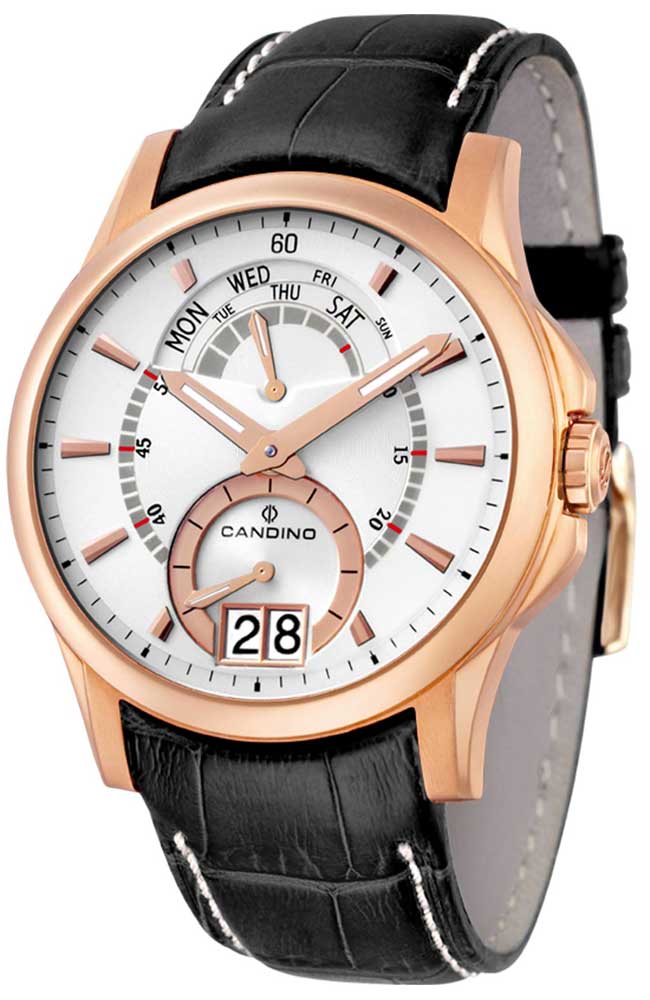 Ανδρικό ρολόι Candino Ελβετικής κατασκευής από ροζ επιχρυσωμένο ανοξείδωτο ατσάλι με λευκό καντράν και μαύρο δερμάτινο λουράκι.