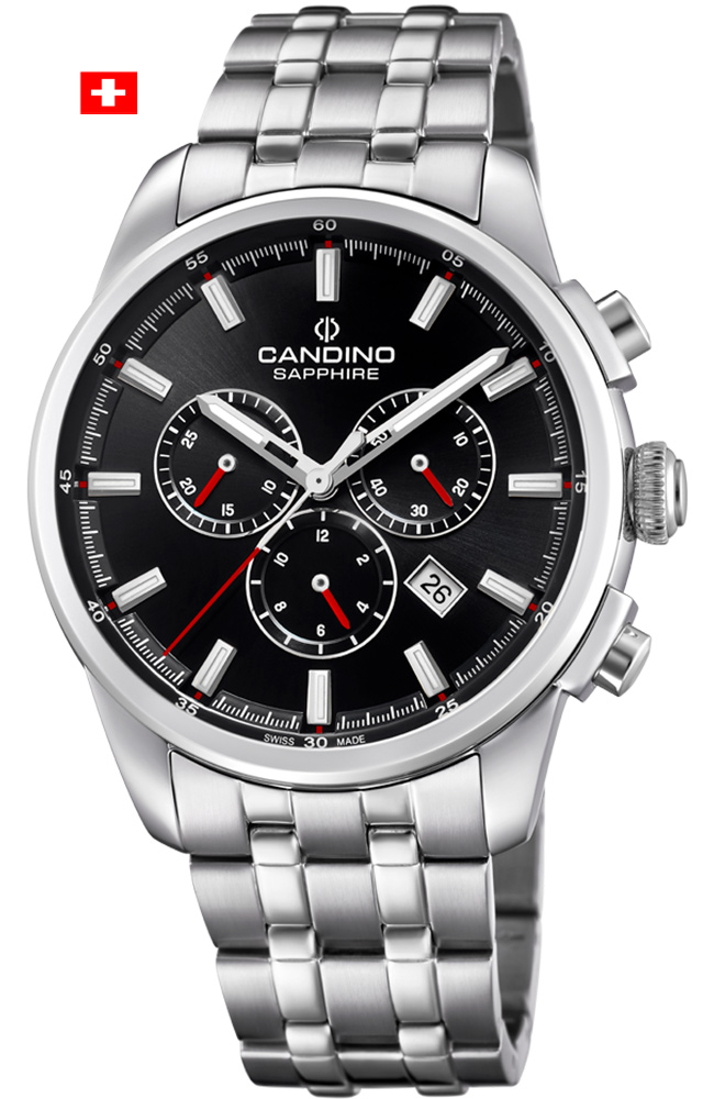 Ανδρικό ρολόι Candino Ελβετικής κατασκευής από ανοξείδωτο ατσάλι με μαύρο καντράν και μπρασελέ.