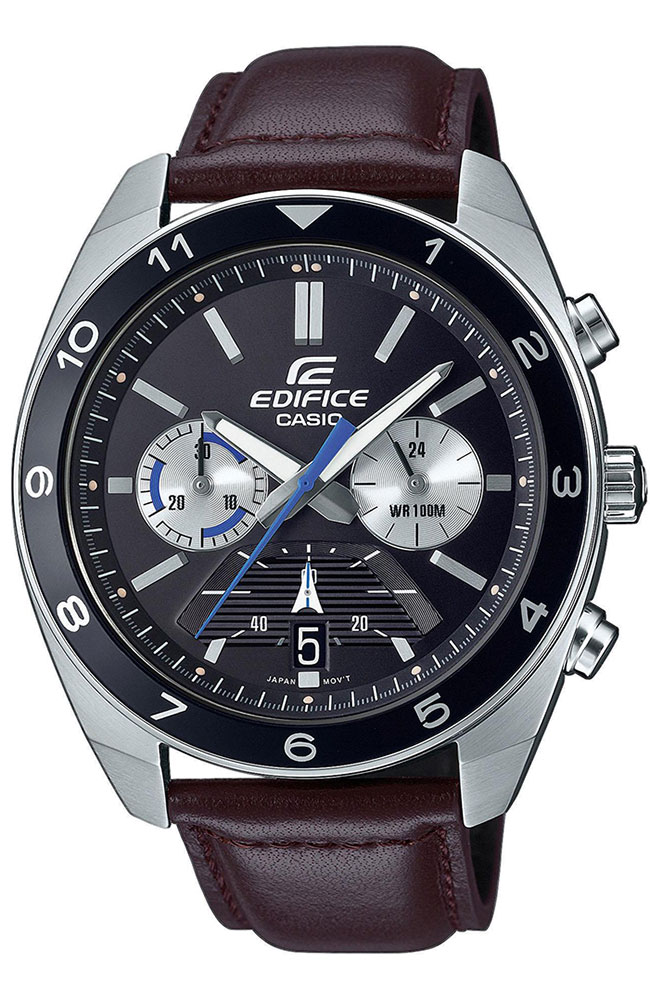 Ανδρικό ρολόι χειρός Casio από ανοξείδωτο ατσάλι με δίχρωμο καντράν και καφέ δερμάτινο λουράκι.