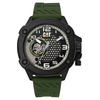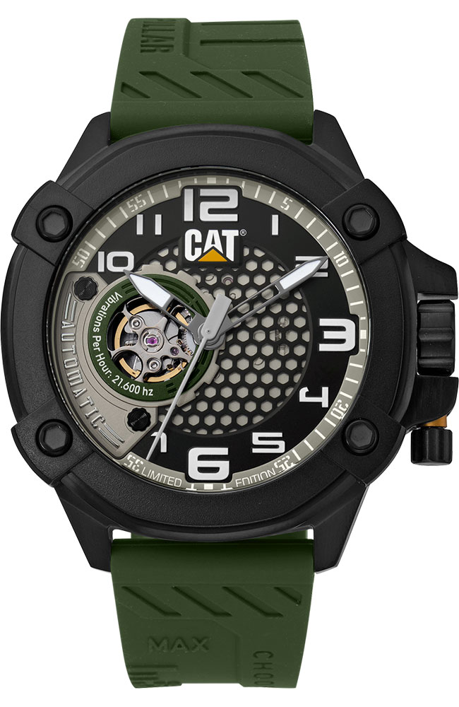Ανδρικό ρολόι Caterpillar με αυτόματο μηχανισμό από μαύρο ανοξείδωτο ατσάλι με μαύρο καντράν και πράσινο καουτσούκ λουράκι.
