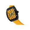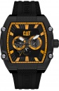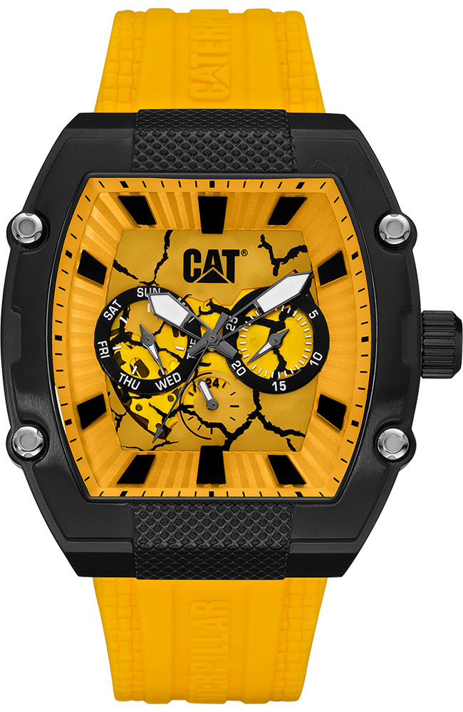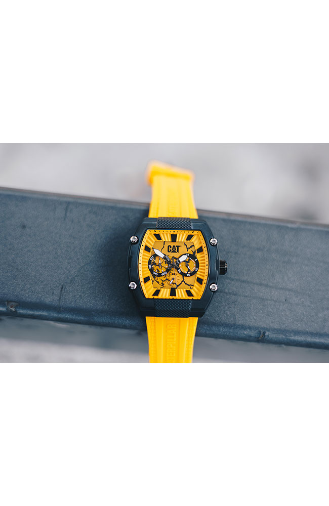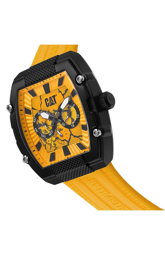 Ανδρικό ρολόι Caterpillar από μαύρο ανοξείδωτο ατσάλι με κίτρινο καντράν και κίτρινο καουτσούκ λουράκι.