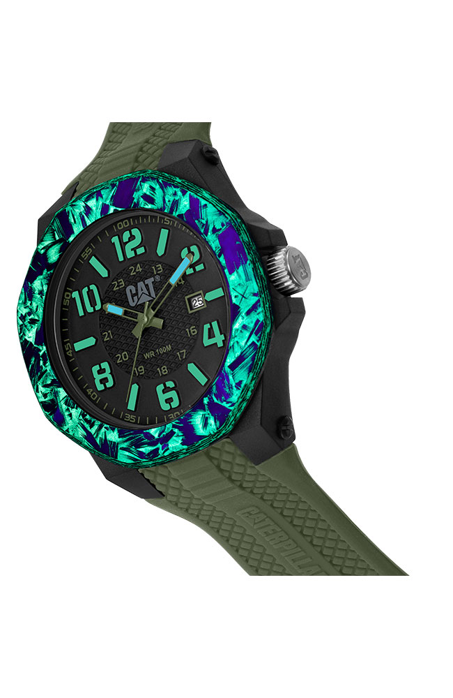 Ανδρικό ρολόι Caterpillar με μαύρο καντράν και πράσινο καουτσούκ λουράκι.