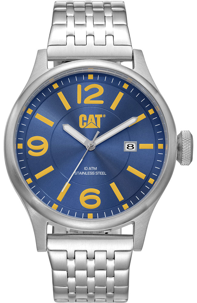 Ανδρικό ρολόι Caterpillar από ανοξείδωτο ατσάλι με μπλε καντράν και ασημί μπρασελέ.