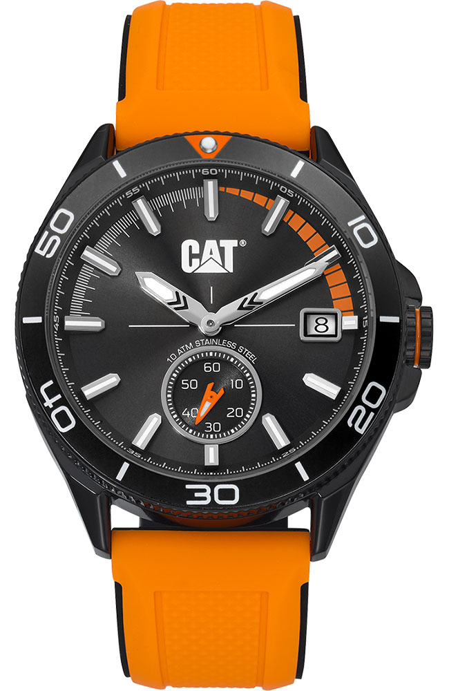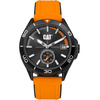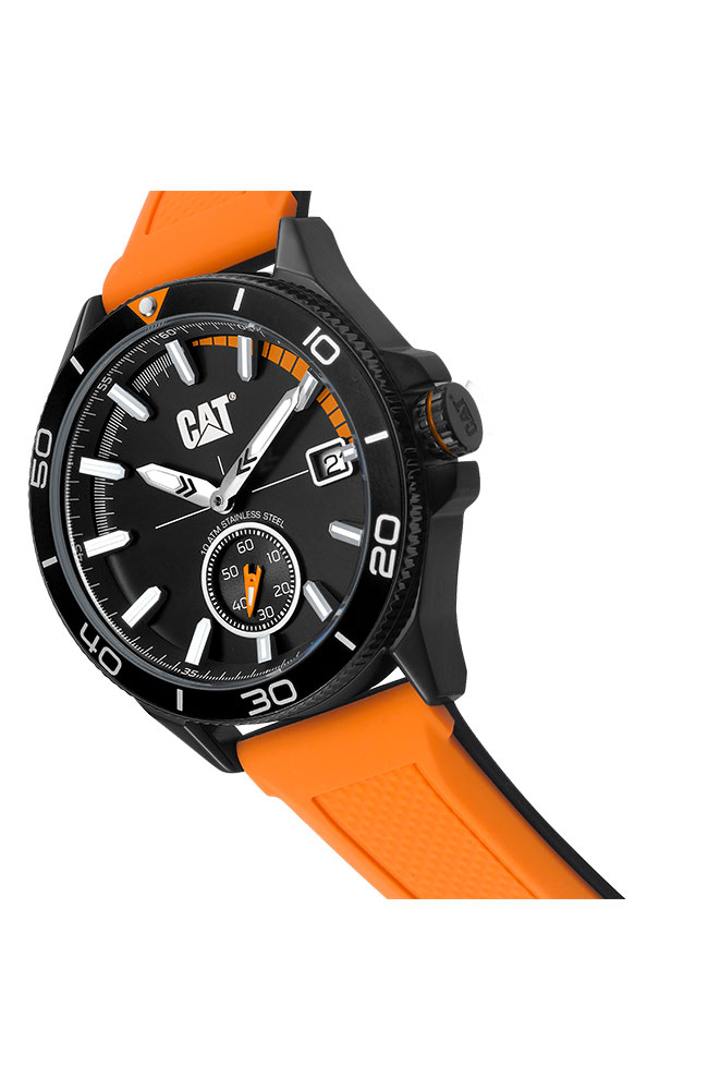 Ανδρικό ρολόι Caterpillar από ανοξείδωτο ατσάλι με μαύρο καντράν και πορτοκαλί καουτσούκ λουράκι.