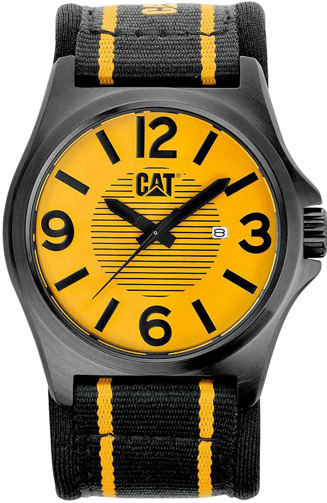 Ανδρικό ρολόι Caterpillar από ανοξείδωτο ατσάλι κίτρινο καντράν και δίχρωμο υφασμάτινο λουράκι.