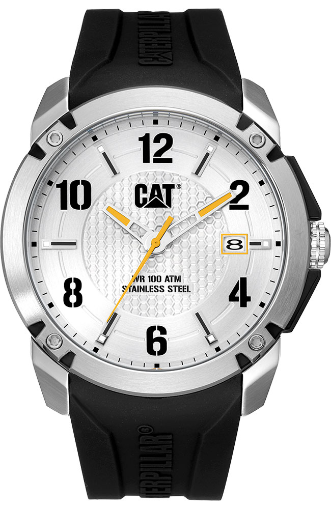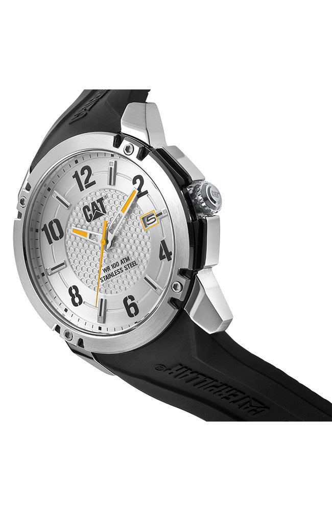 Ανδρικό ρολόι Caterpillar από ανοξείδωτο ατσάλι με λευκό καντράν και μαύρο καουτσούκ λουράκι.