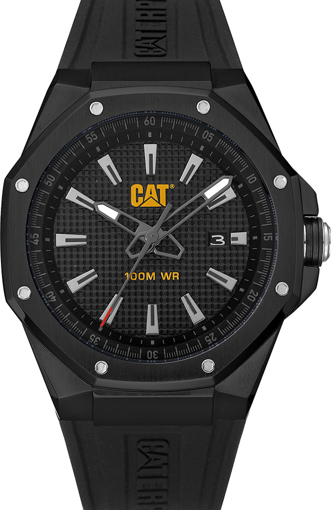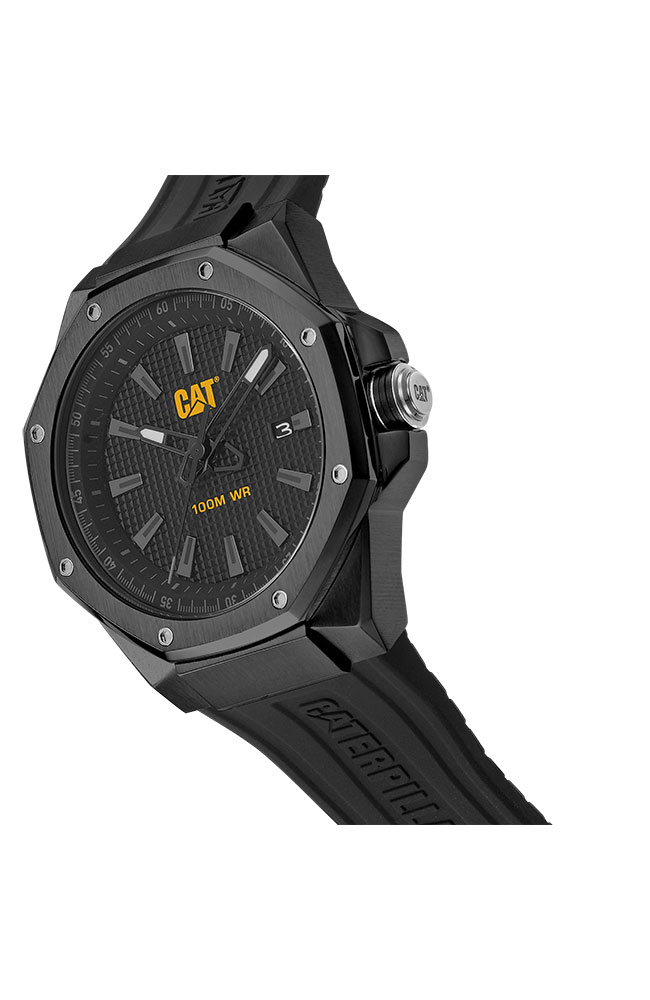 Ανδρικό ρολόι Caterpillar από μαύρο ανοξείδωτο ατσάλι με μαύρο καντράν και μαύρο καουτσούκ λουράκι.