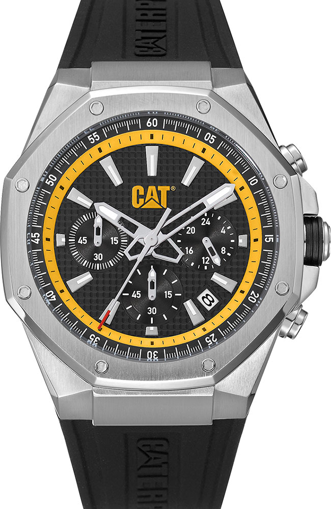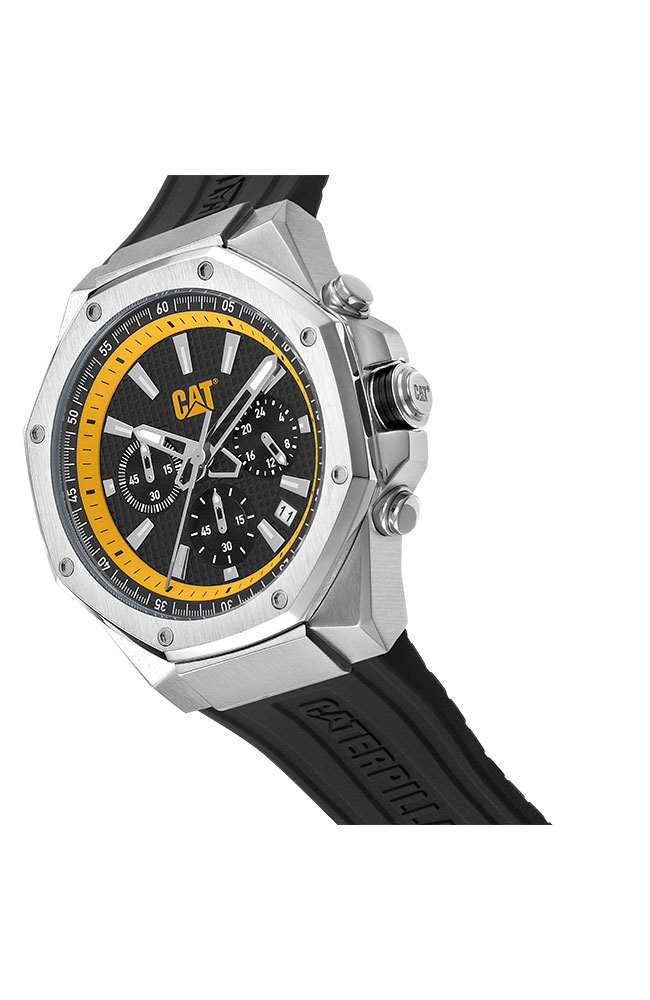 Ανδρικό ρολόι χρονογράφος Caterpillar από ανοξείδωτο ατσάλι με μαύρο καντράν και μαύρο καουτσούκ λουράκι.