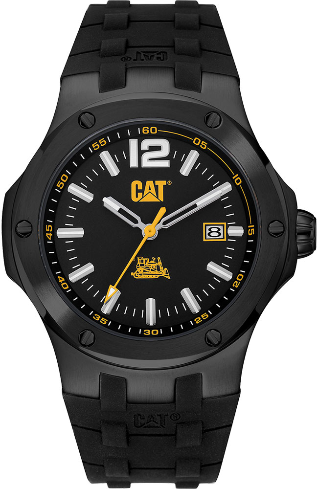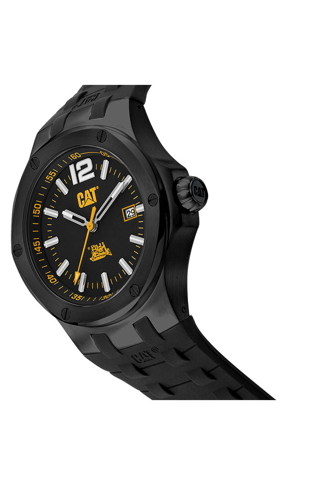 Ανδρικό ρολόι Caterpillar από μαύρο ανοξείδωτο ατσάλι με μαύρο καντράν και μαύρο καουτσούκ λουράκι.