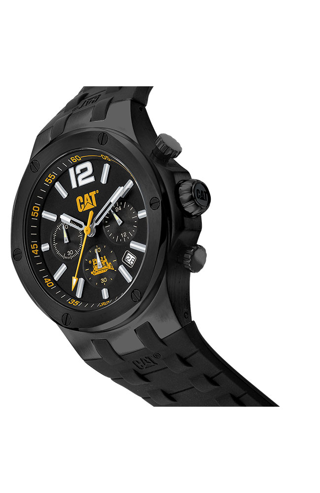 Ανδρικό ρολόι χρονογράφος Caterpillar από μαύρο ανοξείδωτο ατσάλι με μαύρο καντράν και μαύρο καουτσούκ λουράκι.