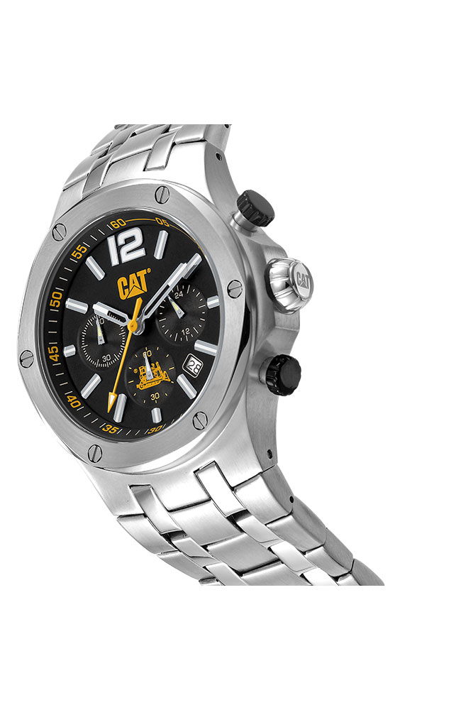 Ανδρικό ρολόι χρονογράφος Caterpillar από ανοξείδωτο ατσάλι με μαύρο καντράν και ασημί μπρασελέ.