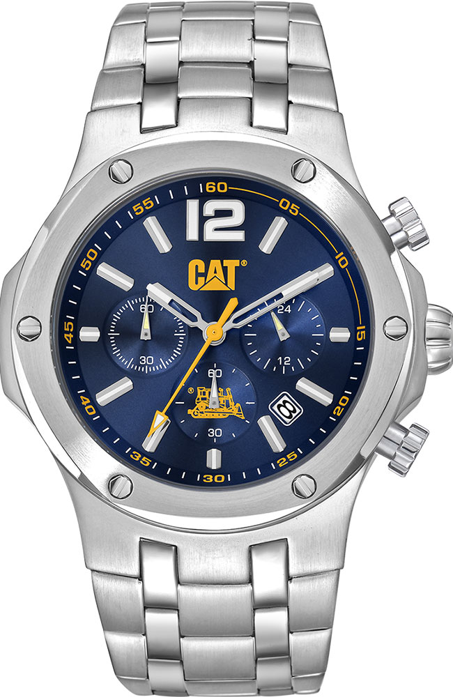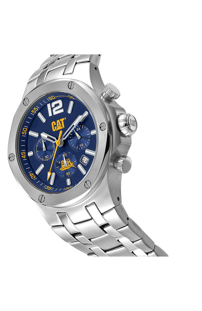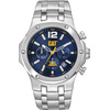 Ανδρικό ρολόι χρονογράφος Caterpillar από ανοξείδωτο ατσάλι με μπλε καντράν και ασημί μπρασελέ.