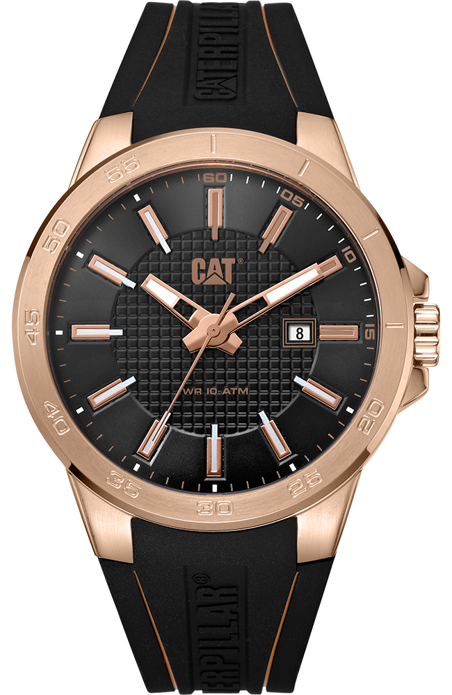 Ανδρικό ρολόι Caterpillar από ροζ επιχρυσωμένο ανοξείδωτο ατσάλι με μαύρο καντράν και καουτσούκ λουράκι.