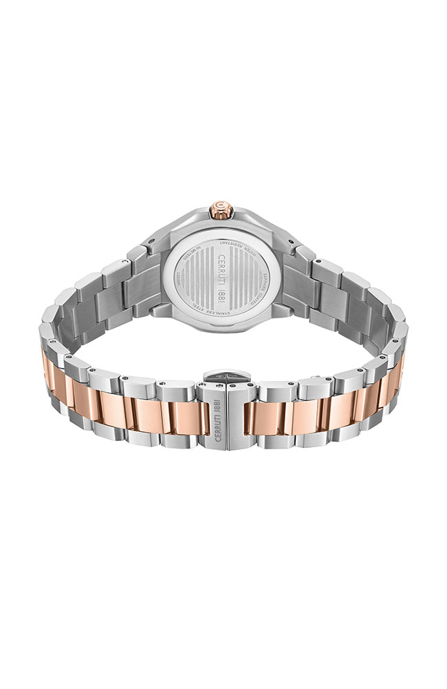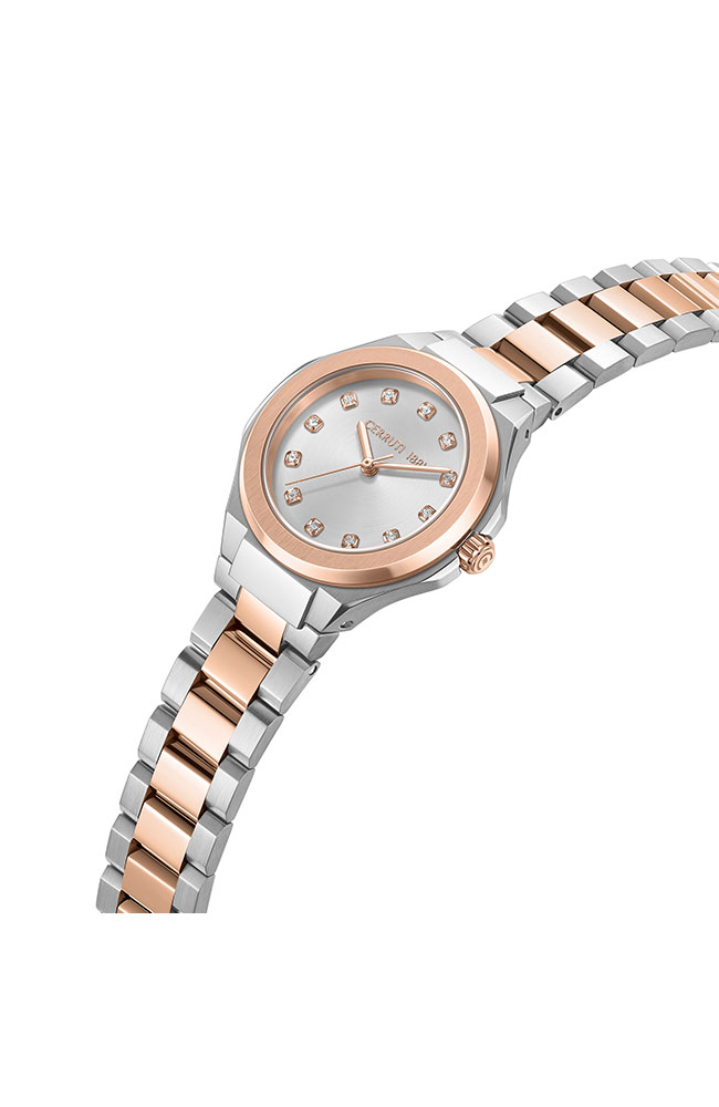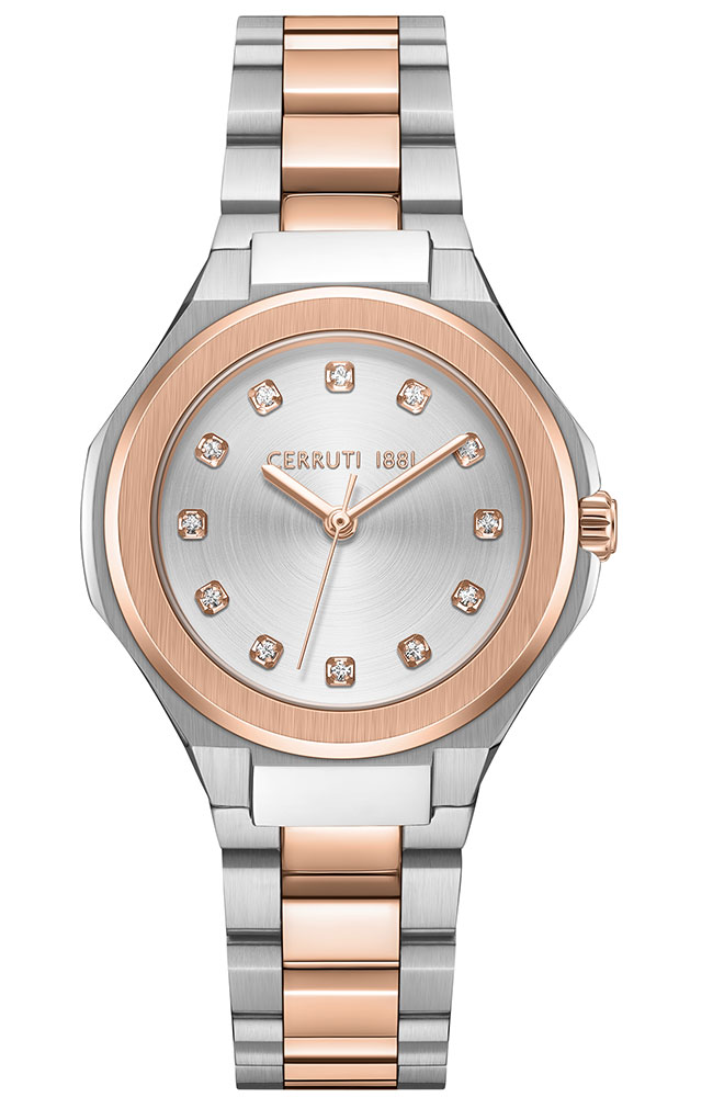 Γυναικείο ρολόι Cerruti από ανοξείδωτο ατσάλι με ασημί καντράν, πέτρες Ζιργκόν και δίχρωμο μπρασελέ.