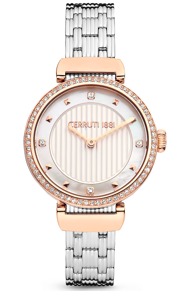 Γυναικείο ρολόι Cerruti από ροζ επιχρυσωμένο ανοξείδωτο ατσάλι με λευκό καντράν, πέτρες ζιργκόν και μπρασελέ.