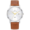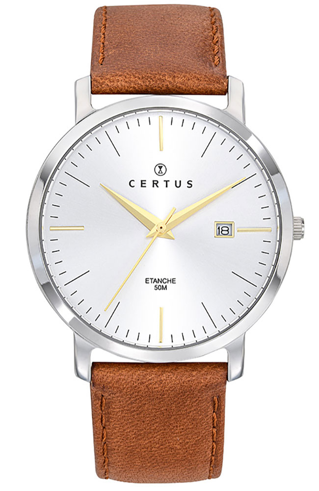 Ανδρικό ρολόι χειρός Certus από ανοξείδωτο ατσάλι με λευκό καντράν και καφέ δερμάτινο λουράκι.