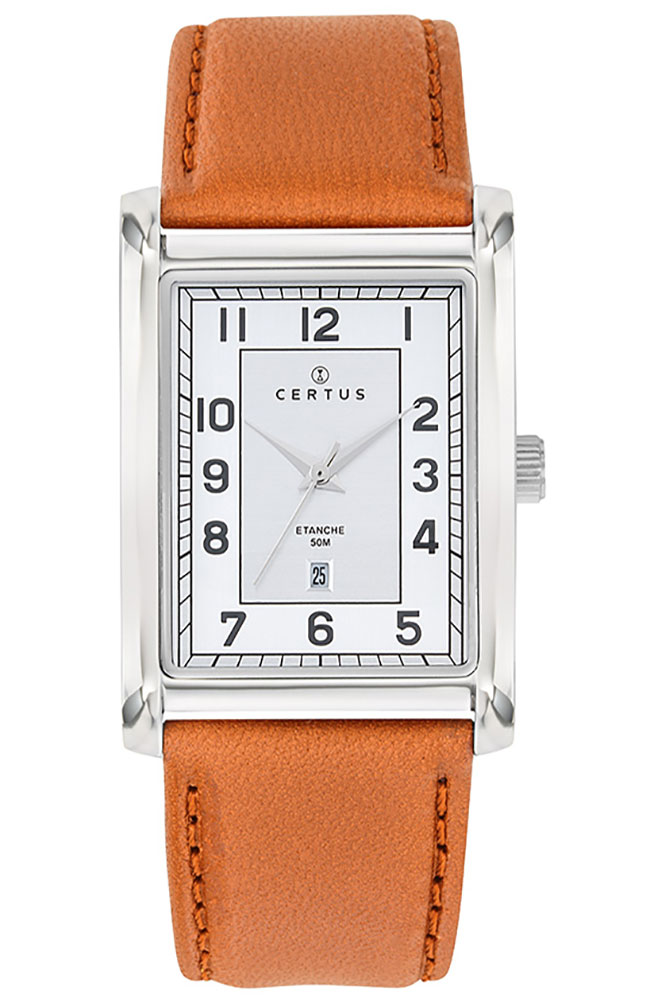Ανδρικό ρολόι χειρός Certus από ανοξείδωτο ατσάλι με λευκό καντράν και καφέ δερμάτινο λουράκι.
