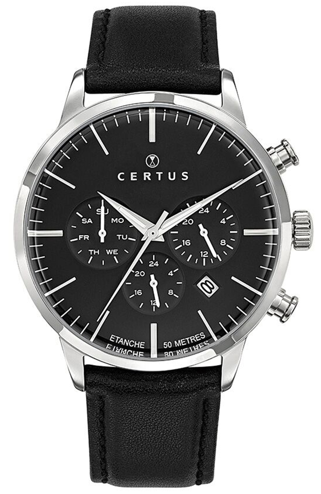 Ανδρικό ρολόι χειρός Certus με μαύρο καντράν και μαύρο δερμάτινο λουράκι.