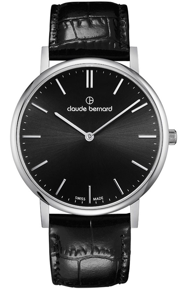 Ανδρικό ρολόι χειρός Claude Bernard Ελβετικής κατασκευής από ανοξείδωτο ατσάλι με μαύρο καντράν και μαύρο δερμάτινο λουράκι.
