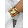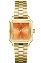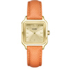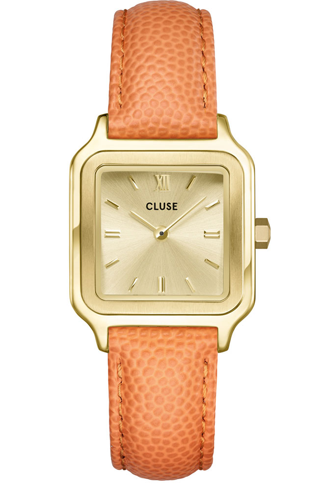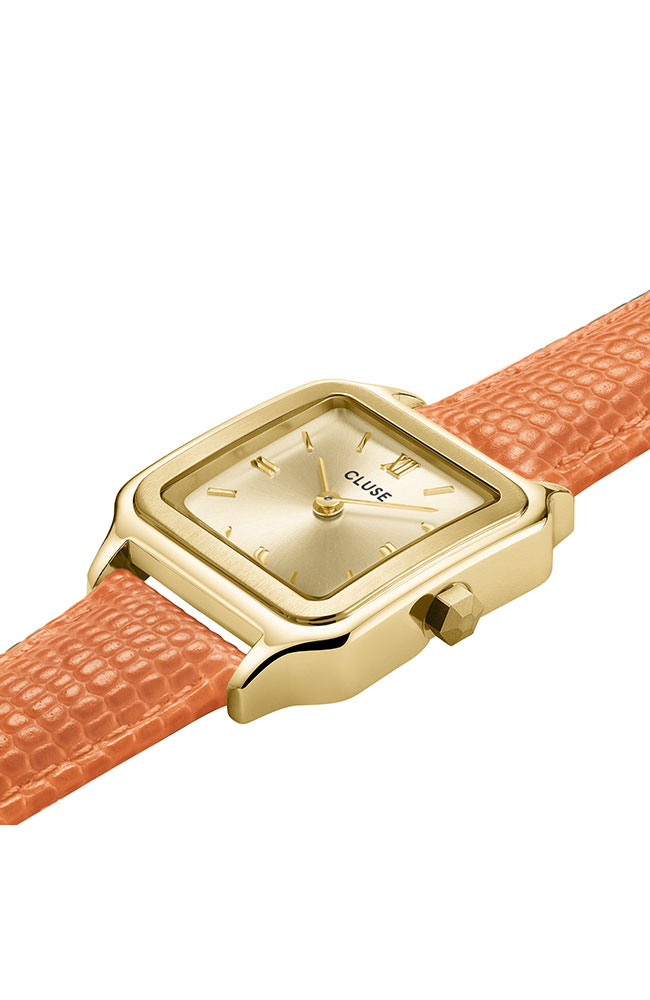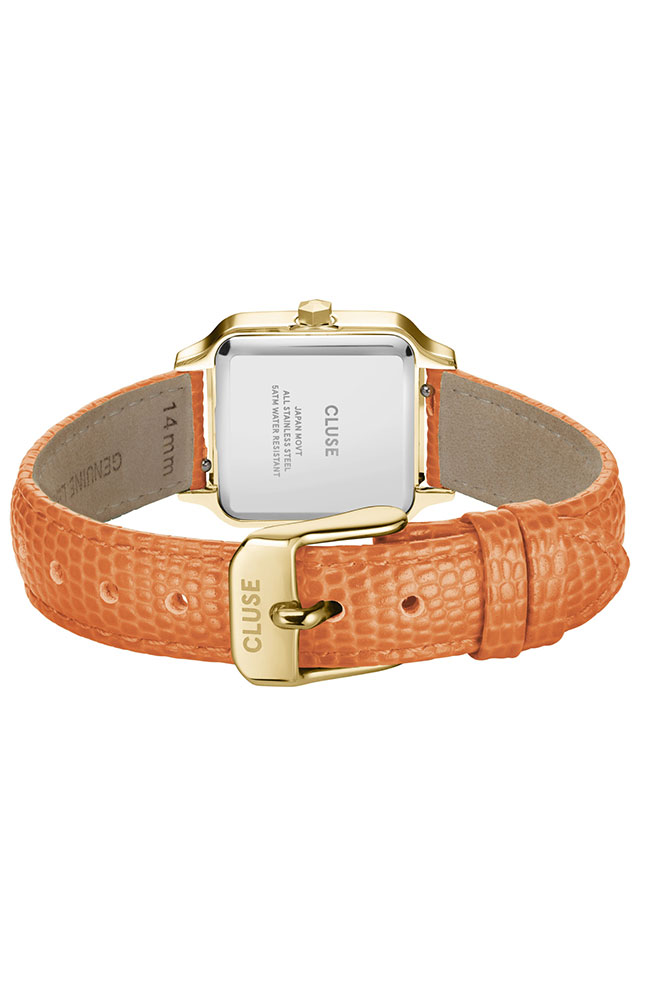 Γυναικείο ρολόι Cluse από επιχρυσωμένο ανοξείδωτο ατσάλι με χρυσό καντράν και πορτοκαλί δερμάτινο λουράκι.