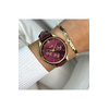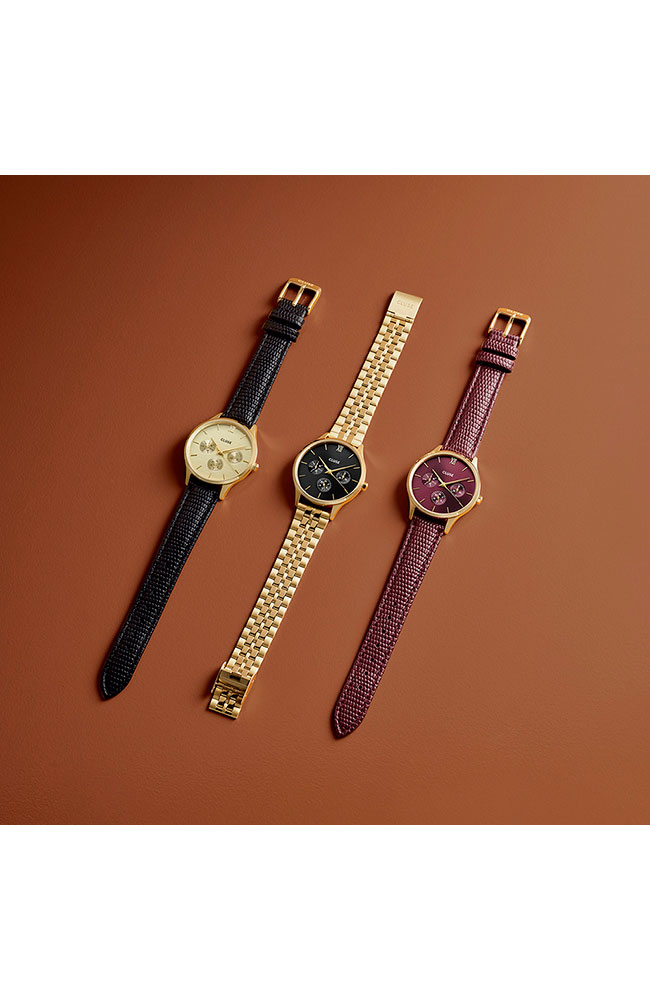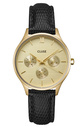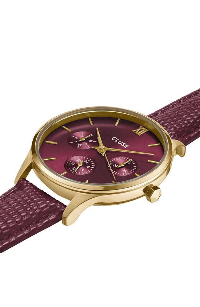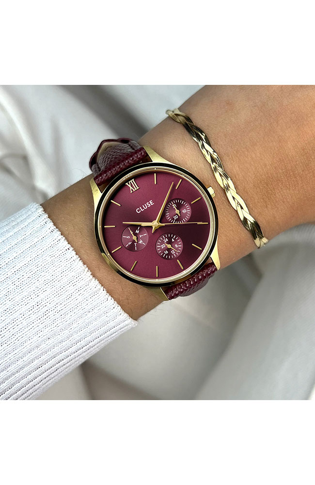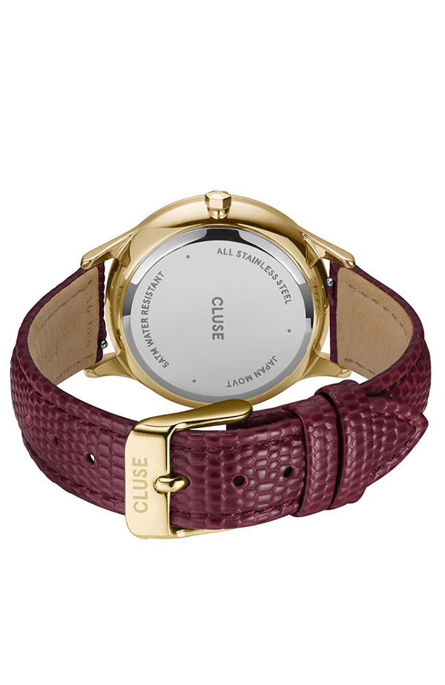 Γυναικείο ρολόι Cluse από επιχρυσωμένο ανοξείδωτο ατσάλι με μπορντό καντράν και δερμάτινο λουράκι.