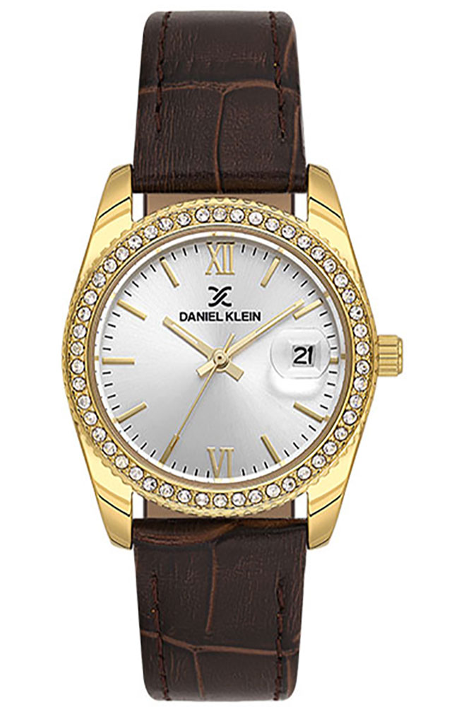 Γυναικείο ρολόι Daniel Klein με ασημί καντράν, πέτρες Ζιργκόν και καφέ δερμάτινο λουράκι.