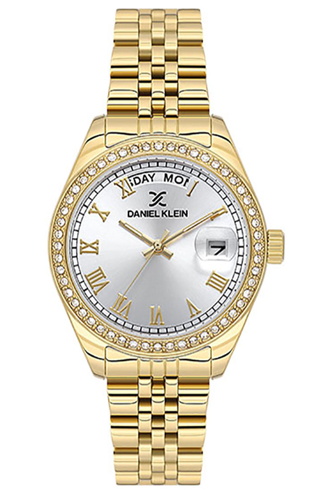 Γυναικείο ρολόι Daniel Klein με ασημί καντράν, πέτρες Ζιργκόν και χρυσό μπρασελέ.