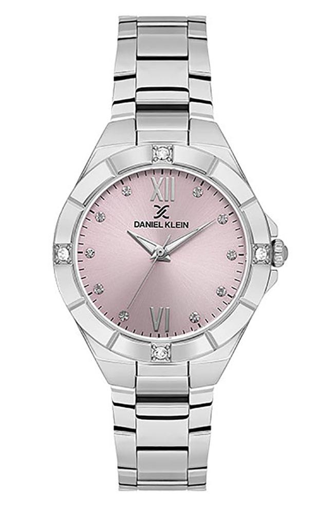Γυναικείο ρολόι Daniel Klein με ροζ καντράν, πέτρες Ζιργκόν και ασημί μπρασελέ.