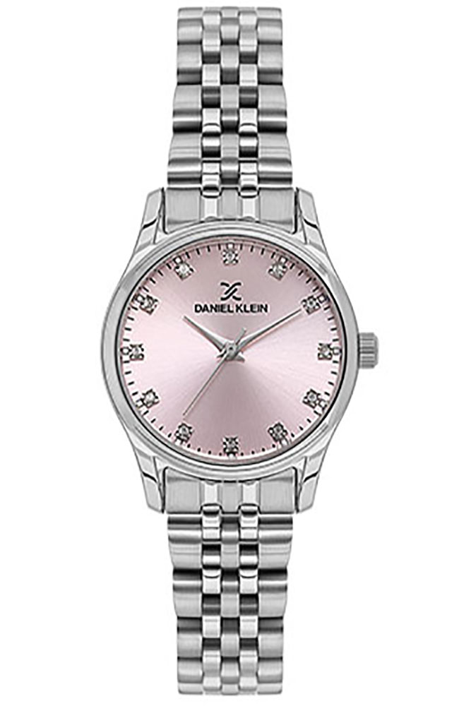 Γυναικείο ρολόι Daniel Klein με ροζ καντράν, πέτρες Ζιργκόν και ασημί μπρασελέ.